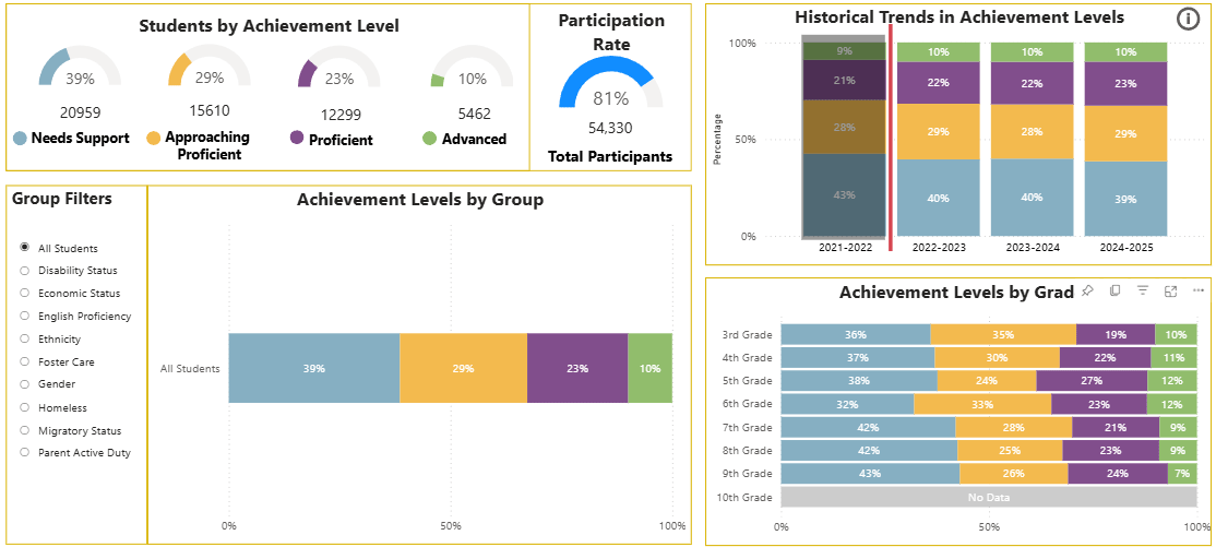 State Summative Assessments - Explore results from summative English/Language Arts, Mathematics, and Science assessments including trends over time, grade level, and by student demographic groups.![]()