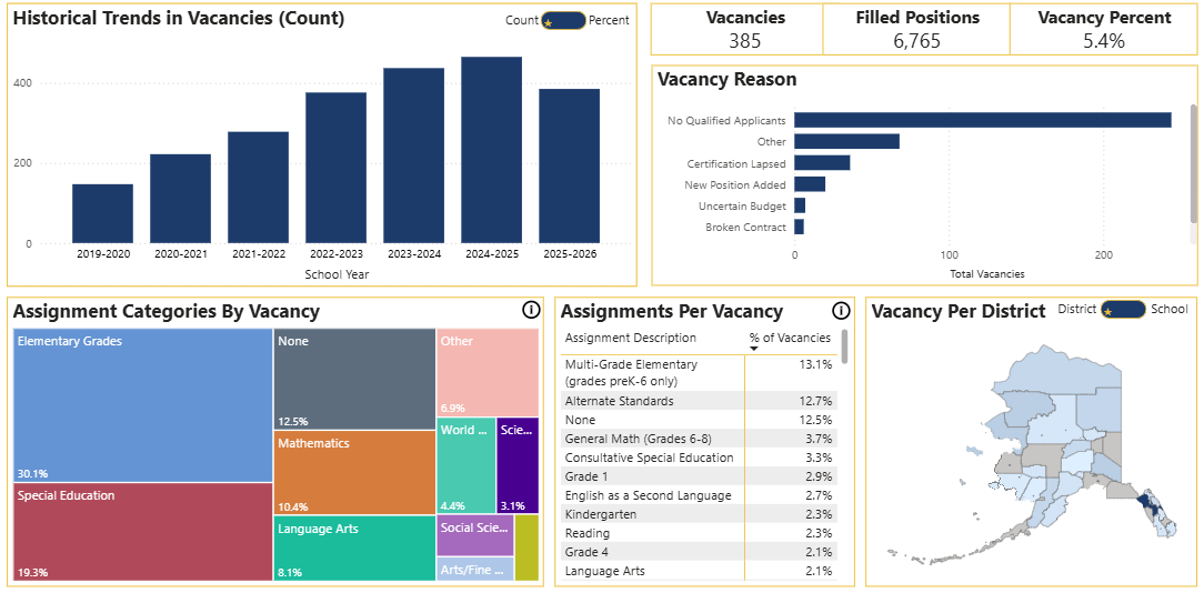 First Day Vacancy - Teaching position vacancy rates by percent or count over time, including by teaching assignment, assignment category, region, and vacancy reason. Select multiple districts or schools.![]()